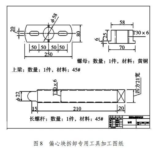 (4)黄铜螺母底部带6mm的台阶用于和上梁板装配时的定位,和承受拆卸力矩。改进后偏心块拆卸专用工具图纸如图7,加工图如图8所示。